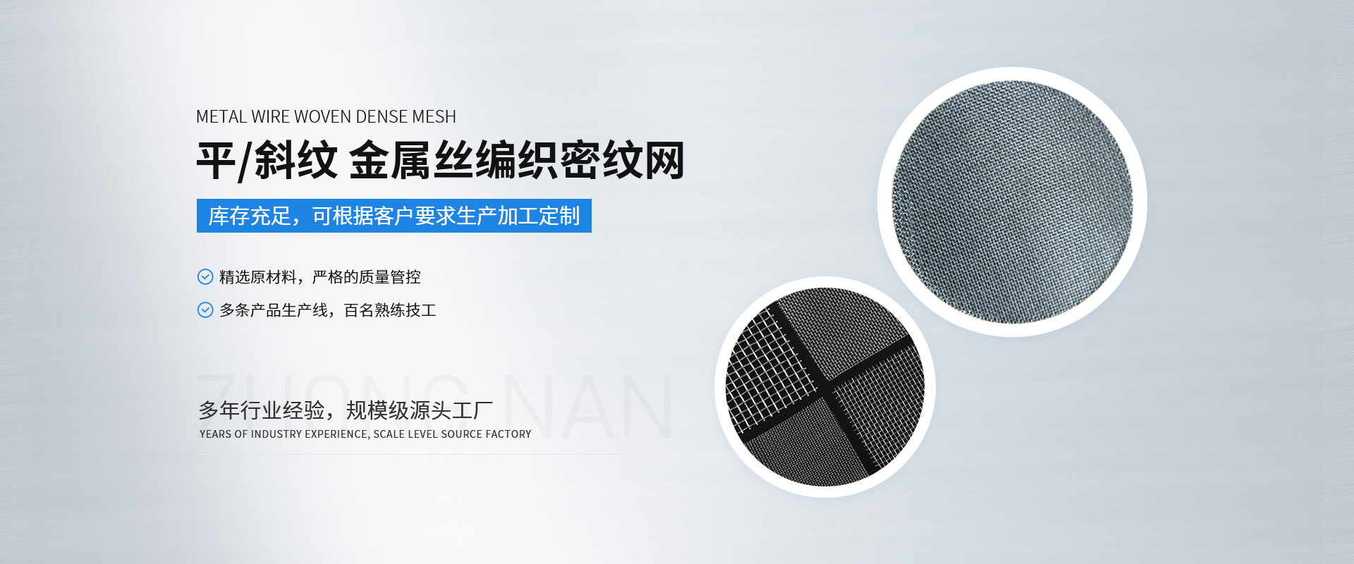 新鄉市中南金屬網有限公司成立于1999 年,公司設在河南省新鄉市。在過去的十幾年來,我們堅持以嚴格的管理措施、雄厚的技術力量、良好的工藝設施,質量上乘、信譽為上為原則,把樹立良好的企業形象為工作宗旨,歷經市場的嚴峻考驗并贏得廣大用戶的一致好評。金屬絲網編織結構形式有平紋和斜紋兩種方法,嚴格按照航空軍品標準HB1862—93和標準GB/T5330—2003標準,并等效采用國際標準ISO9044—90標準組織生產。 公司擁有生產設備和技術人員,主要生產不銹鋼篩網、磨料網、金屬絲編織方孔網、篩網、濾網 、篩分網 、過濾網、不銹鋼網、絲網、金屬絲網、金屬絲編織密紋網、特種網、不銹鋼密紋網、荷蘭網、席型網。絲網材質選用黃銅、錫青銅、不銹鋼、純鎳等。席型網規格7/44目—500/3500目,方孔網規格1/2目—500目,網孔25mm—0.028mm,產品廣泛用于機械、化工、化纖、石油、醫藥、橡膠、濾芯、固體果粒篩分、流體過濾以及裝飾、防塵、骨架支撐等?! ∥覀円浴耙曎|量為生命、以信譽求生存、以科技促發展、以優*產品為客戶服務”的經營理念,真誠的希望與各界人士攜手并進,共創輝煌!